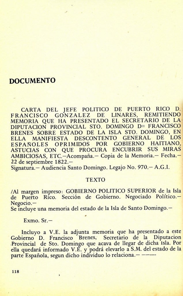 Don Agustín Tabares Presbítero y Sochantre de la Sta. Iglesia Catedral encontró este libro de Bautismos: en Sto. Domingo en la capital; en manos de un cualquiera, con el motivo del incendio que hicieran los indígenas en las ciudades, pueblos y villas de esta isla, el año 5 de este siglo 800 (XIX), por esta causa no se siguió en este, y fue preciso poner las partidas en otro, donde principio a la vuelta de este otro año. Siguiendo el número y que comienza el de octubre.