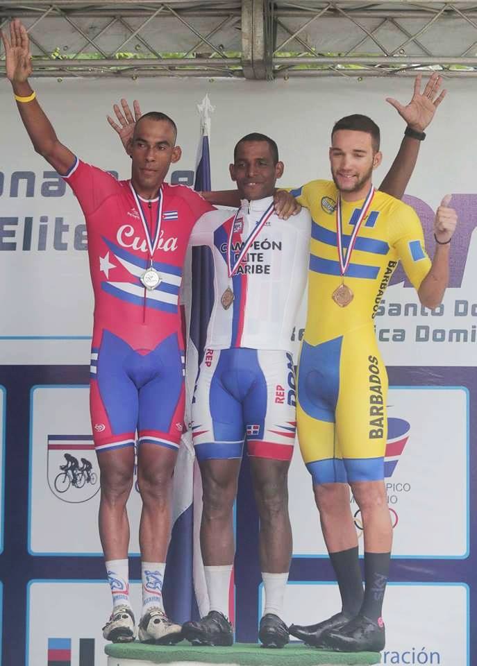 Ganadores de medallas de oro, plata y bronce en un torneo de ciclistas internacionales en Santo Domingo. Desde izquierda a derecha aparecen los representates de Cuba, República Dominicana y Barbados.