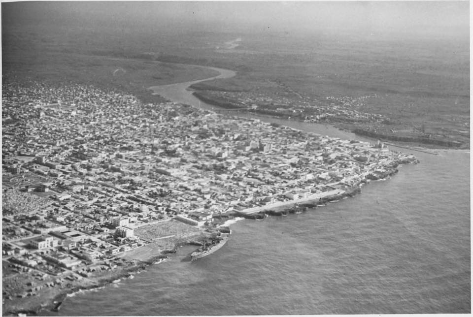 Una vista aérea de Santo Domingo en los 1920s. Nótese el puente Ozama sobre el río Ozama.