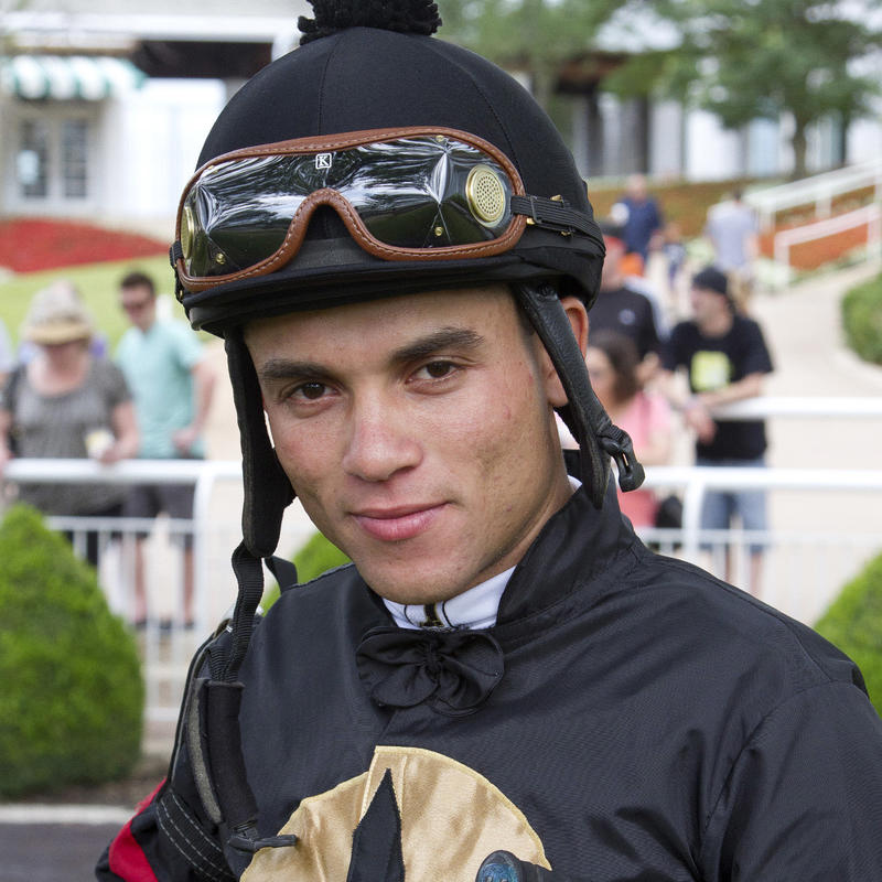 Joel Rosario con el trofeo por ganar el Belmont Stakes en Elmont, New York, Estados Unidos.