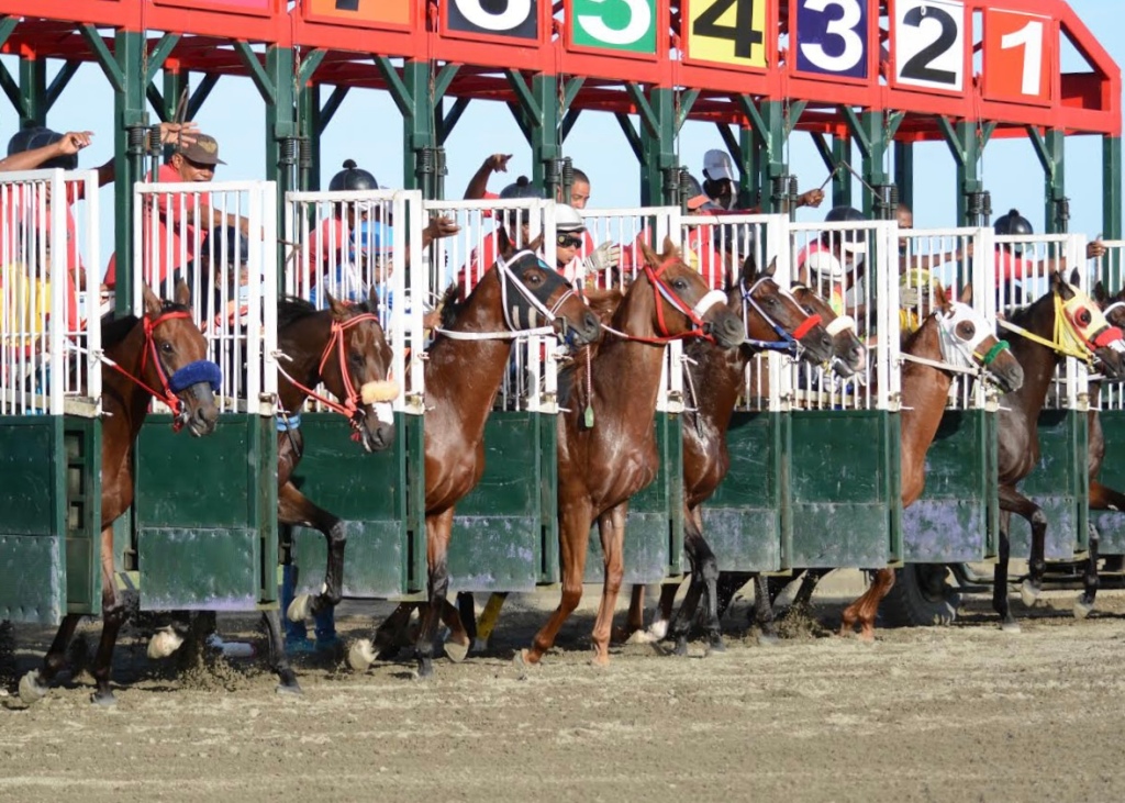 El inicio de una carrera de caballos en el hipódromo Perla Antillana.