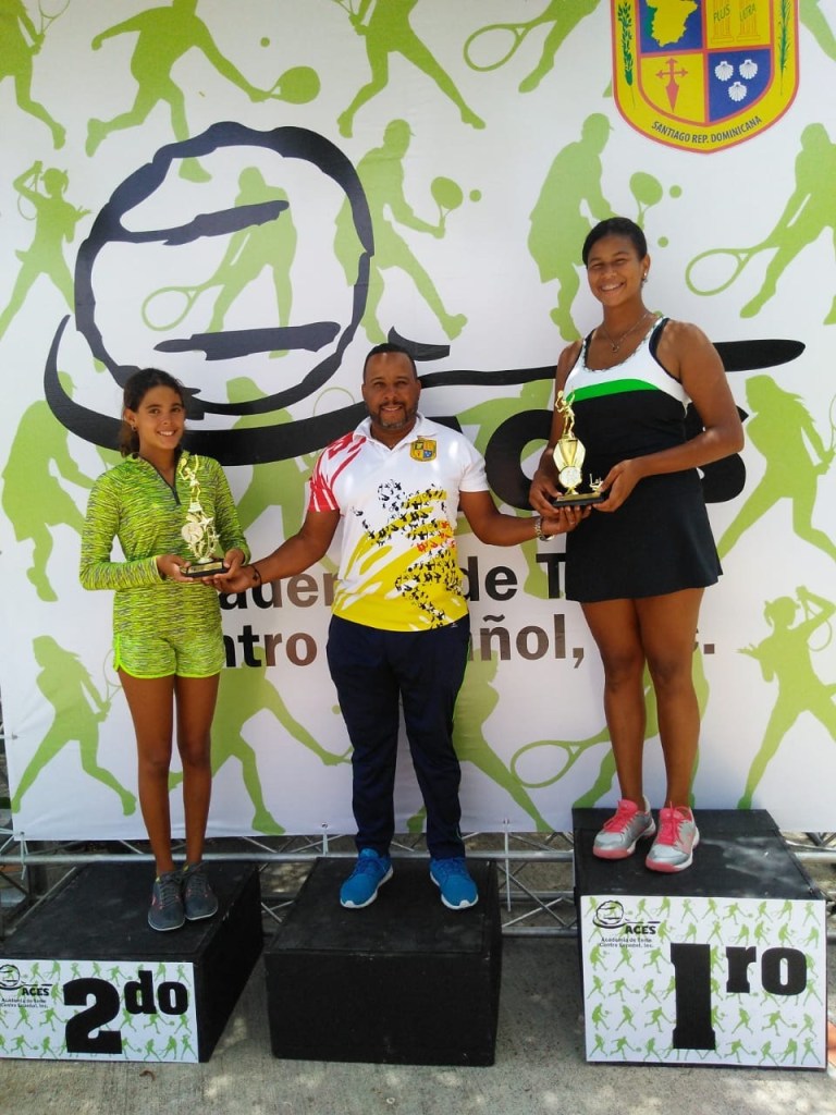 Dos jovencitas reciben trofeos de primer y segundo lugar por sobresalir en un torneo de la Academia de Tenis Centro Español en Santiago de los Caballeros.