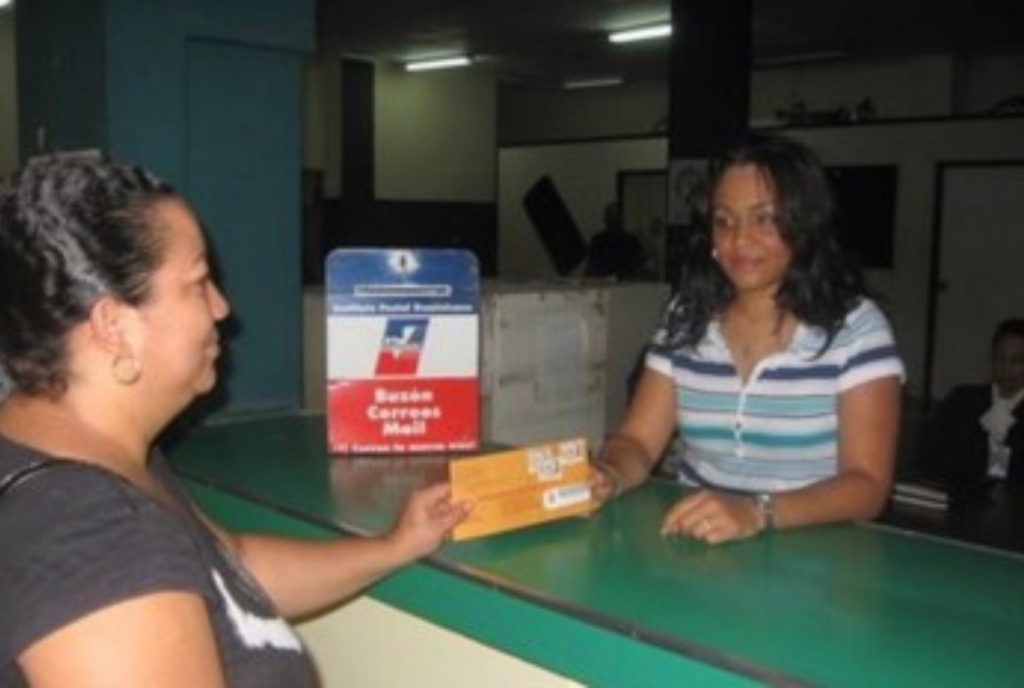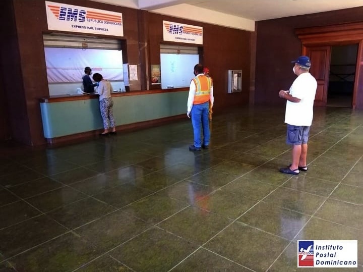 Clientes dominicanos entregando o recogiendo correspondencias en la ventanilla de EMS en el Palacio del Instituto Postal Dominicano.