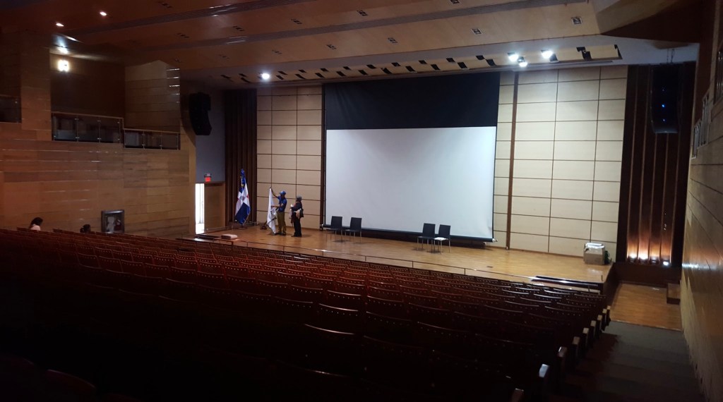 Una esquina del recién remodelado Palacio del Instituto Postal Dominicano. Nótese el podio y las dos banderas, una del país y otra de INPOSDOM, lo que indica una rueda de prensa con el Director de INPOSDOM.