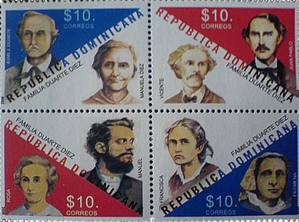 La fsmilia Duarte Díez en la que pertenecía uno de los padres de la patria (Juan Pablo en la equina derecha superior). Su padre, oriundo de Jerez de la Frontera en España, y su madre en el sello de la izquierda superior. Los demás eran sus hermanos y hermanas.