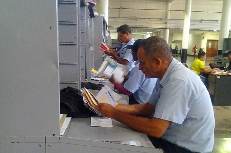 Carteros dominicanos revisando las cartas que llevarán a domicilio en Santo Domingo.