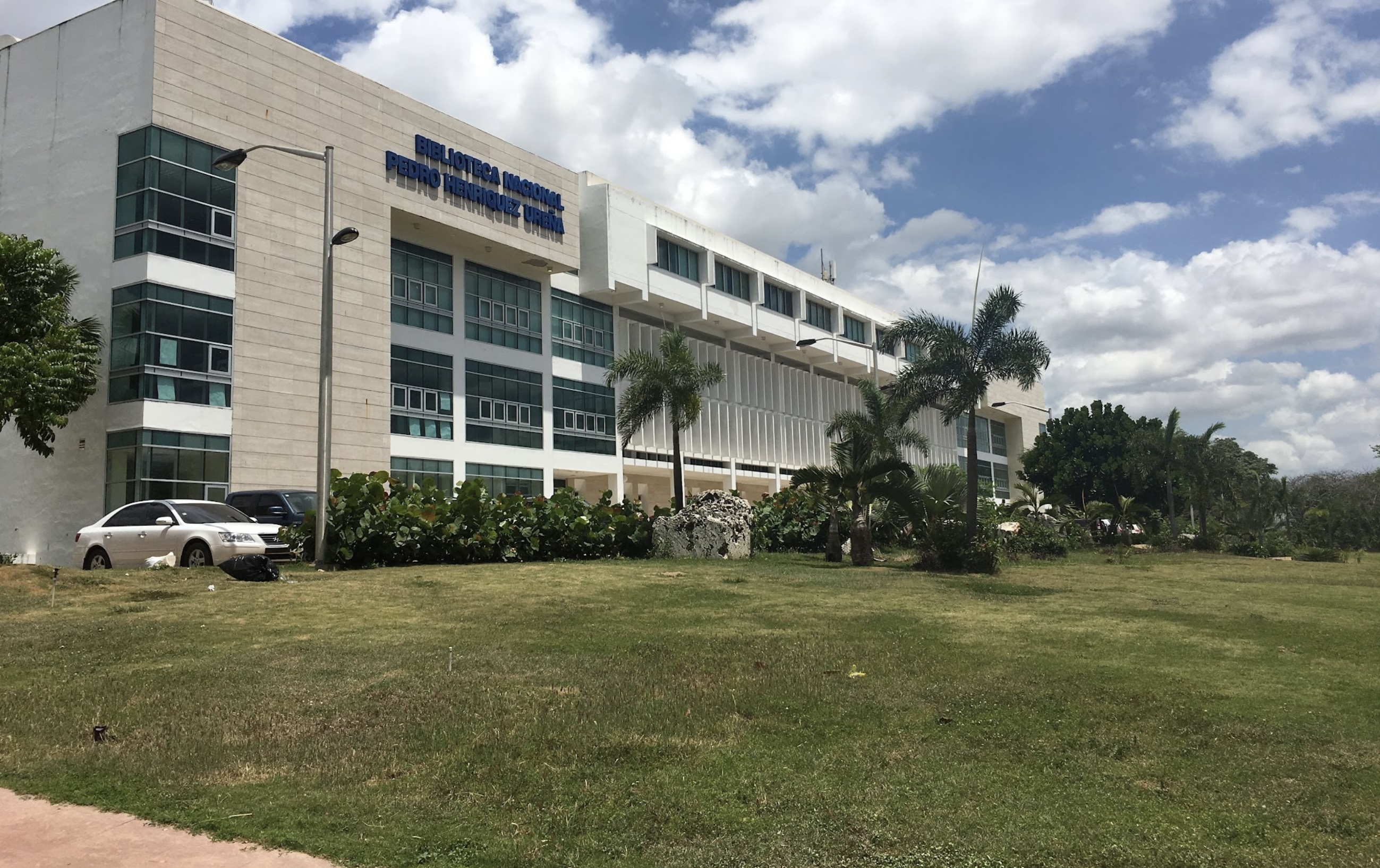Vista de la fachada. Se puede apreciar lo bien que es la transición entre el pedazo de la Biblioteca Nacional Pedro Henríquez Ureña original y las dos ampliaciones, siempre conservando la forma y el color del original. Parte del jardín frontal es visible.