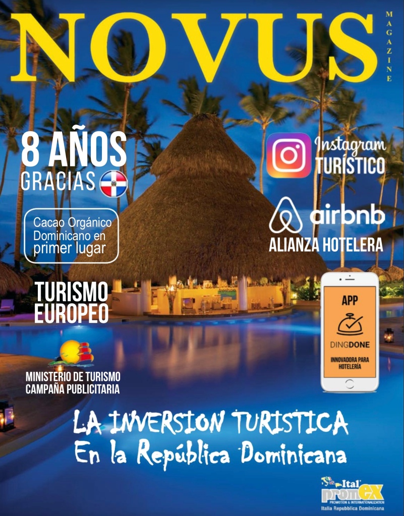 La revista dominicana Novus cubre varios temas. Esta portada tiene que ver con el turismo en la República Dominicana con una imagen de una piscina en uno de los resorts del país.