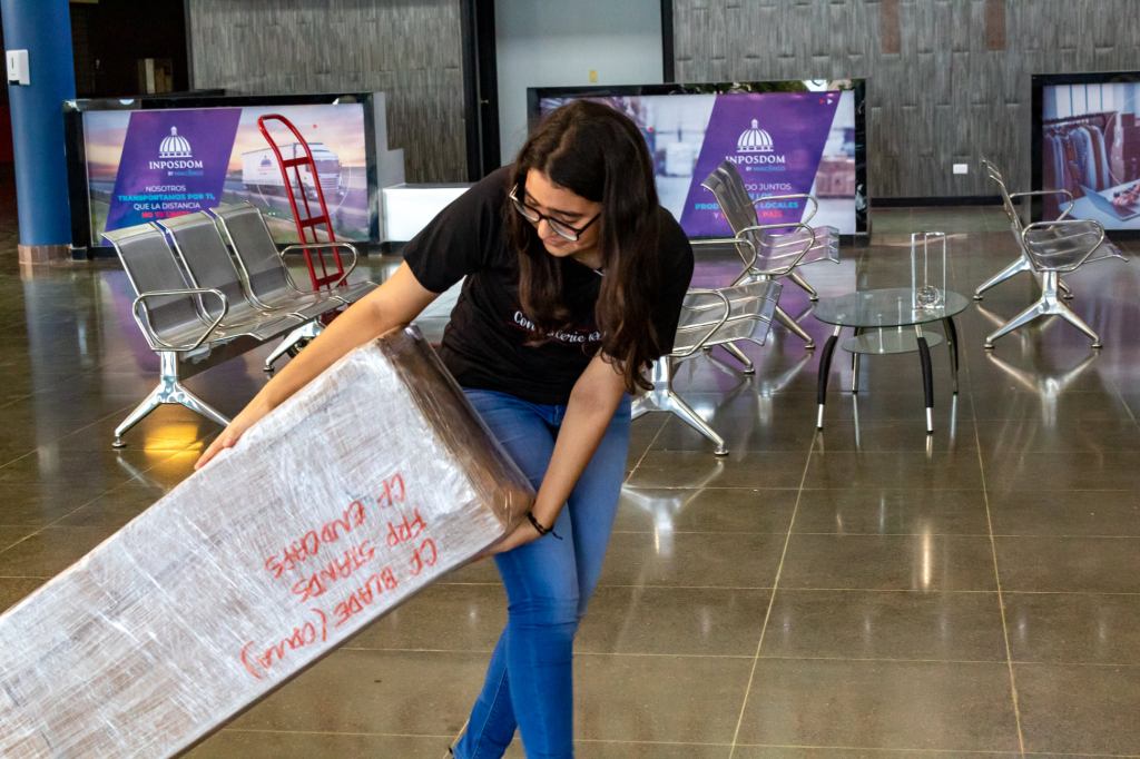 Una voluntaria dominicana moviendo un paquete mientras en el fondo se observan los muebles y los monitores planos que se añadieron en la remodelación reciente del Palacio del Instituto Postal Dominicano.