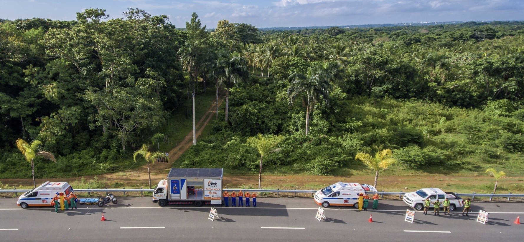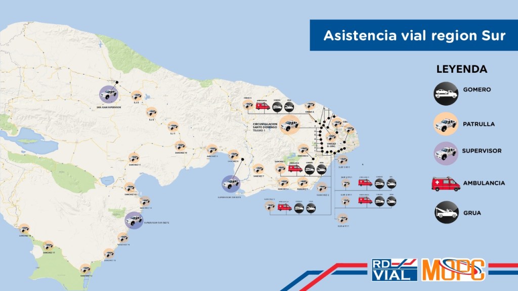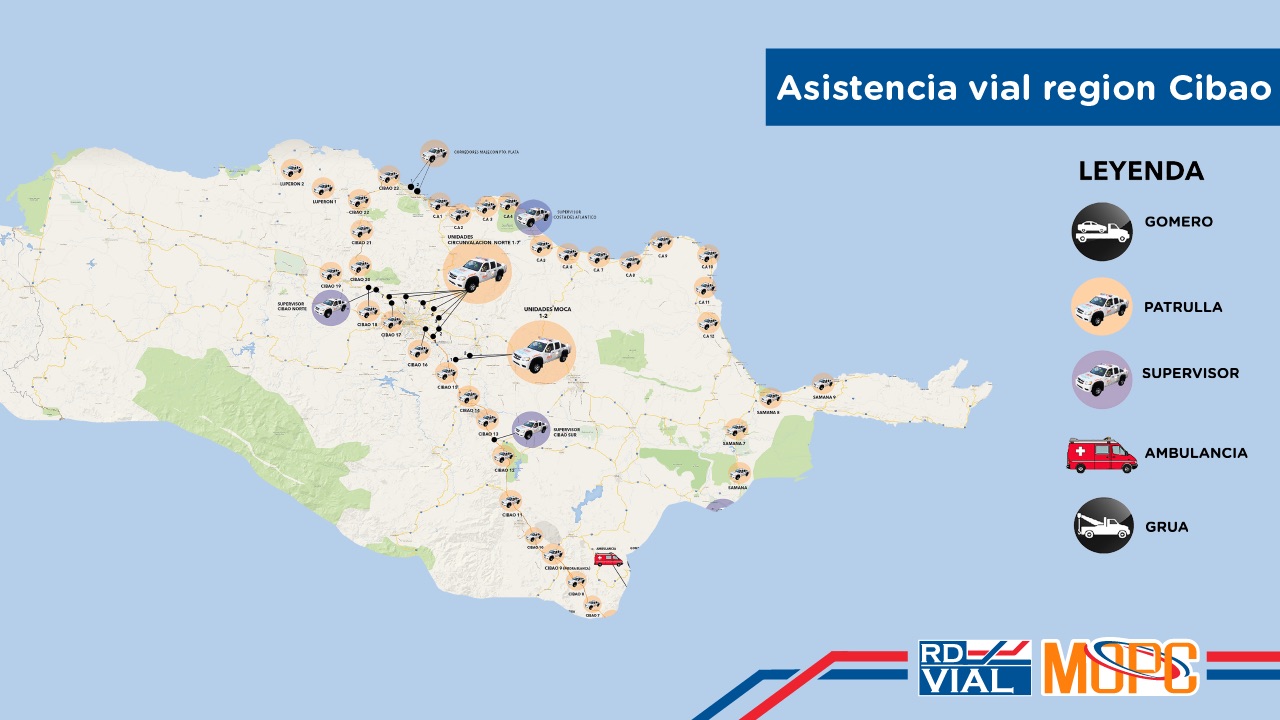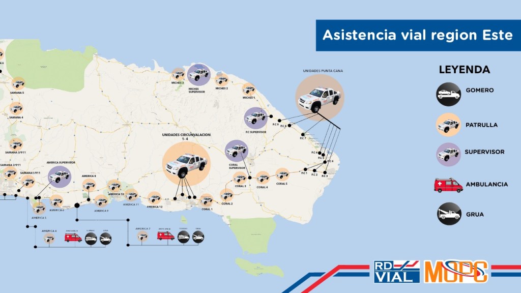 En adición, la asistencia vial está compuesta por un centro de mando regional (COE móvil) y 99 puestos de socorro, es decir rutas alternas en zonas de alto flujo peatonal como Higüey, Santiago y la Ciudad Colonial de Santo Domingo.