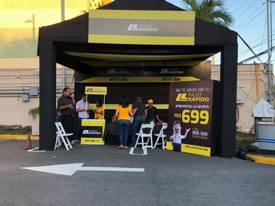 Caseta temporal que se establece en un parqueo y en ello se ofrece mas información y venta de los kits de Paso Rápido. Nótese la mascota del Ministerio de Obras Públicas y Comunicaciones (MOPC).