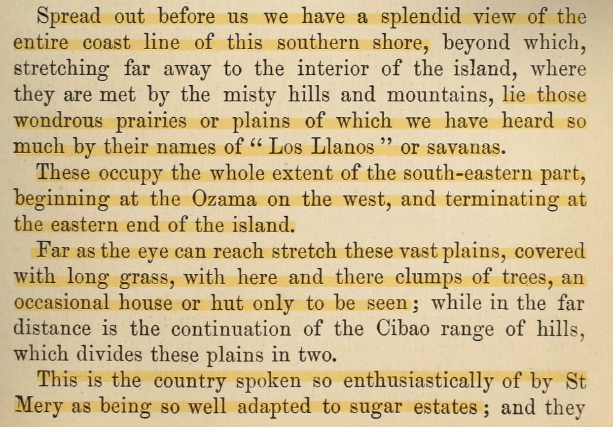 Toda la vista es de estos llanos cuvierto en gramas altas con islas de árboles aquí y allí, y una casa o bohío aleatoriamente.»