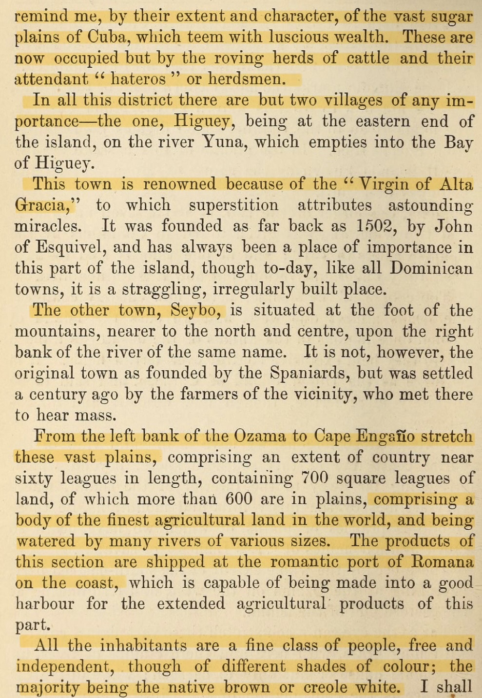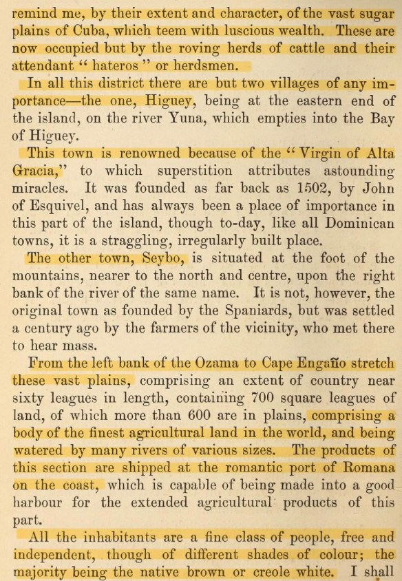 «…consiste de las mejores tierras para la agricultura en el mundo y es bañada por varios ríos de muchos tamaños. Las producciones de esta llanura se exportan por el puerto de Romana.»
