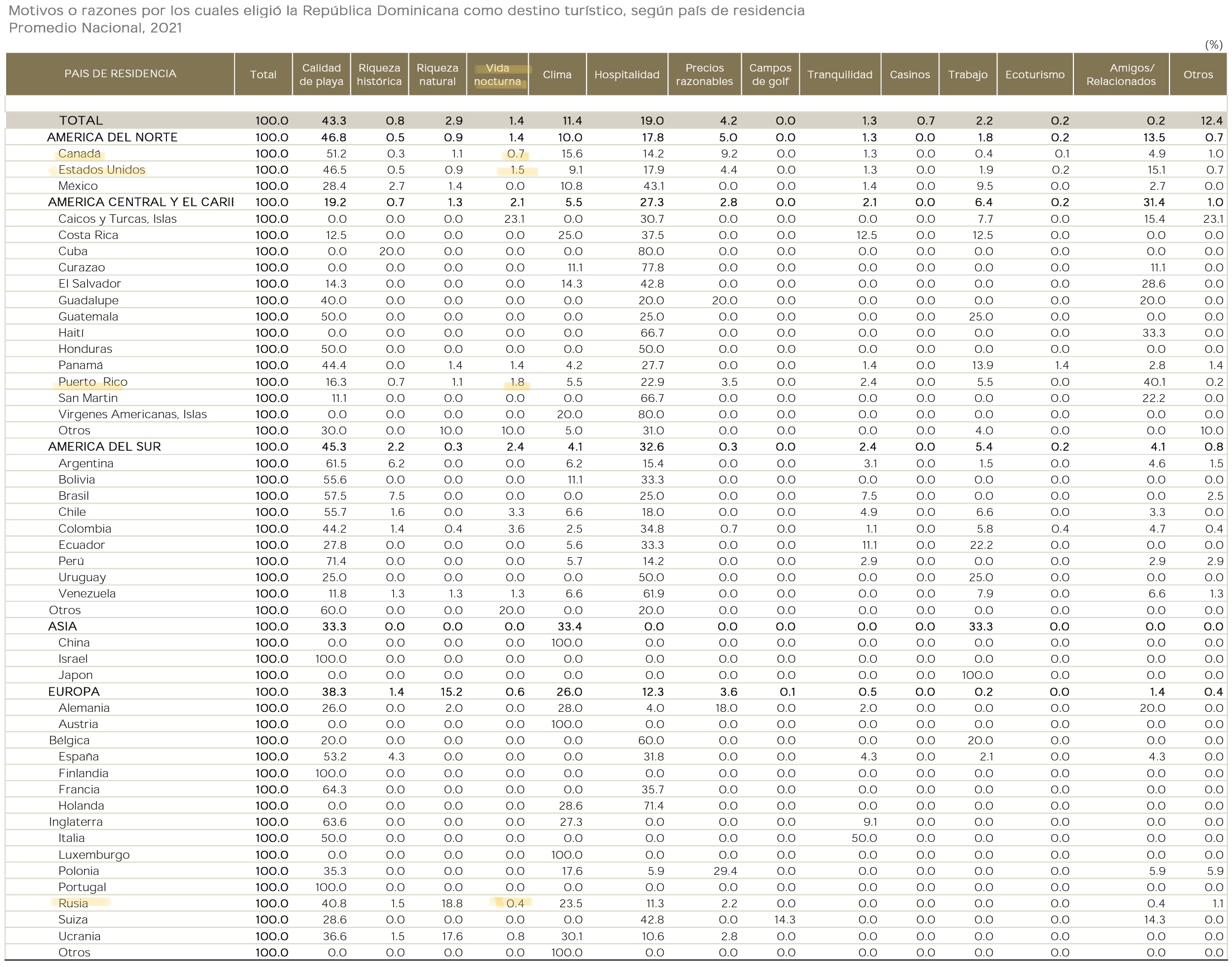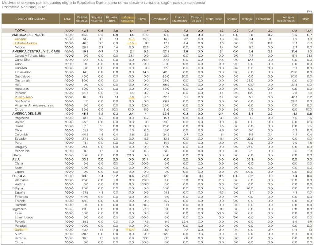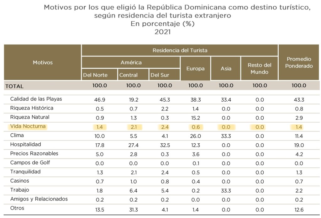 En diciembre del 2021 el Banco Central de la República Dominicana publicó la «Encuesta de opinión, actitud y motivación a extranjeros no residentes» basado en un cuestionario que se les dio para que lo respondieran extranjeros no residentes (turistas) en los aeropuertos internacionales de la República Dominicana. Entre los hallazgos está que la vida nocturna (en la que se incluye la prostitución) fue el motivo por los que eligió visitar a la República Dominicana promedia en 1.4%. En el caso de países específicos podemos ver (de mayor a menor) esto involucra al 1.8% de los procedentes de Puerto Rico, 1.5% de los Estados Unidos, 0.7% de Canadá y 0.4% de Rusia.