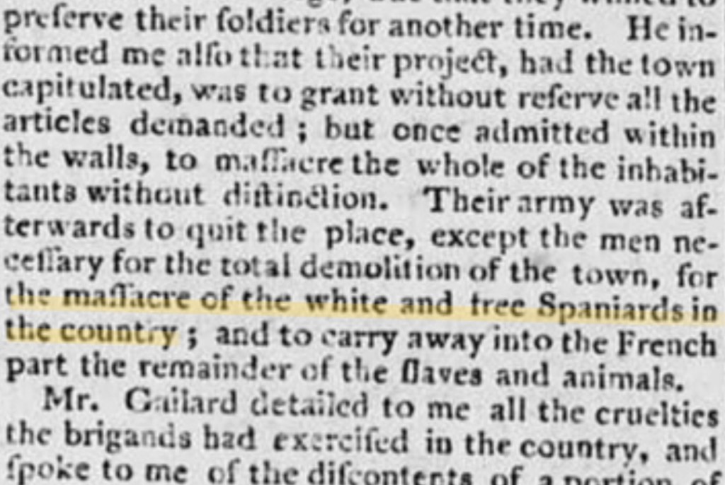 «…François. El total de muertos fue 742 personas entre los cuales incluía a tres mujeres, sin embargo no incluía a una cantidad muy grande que fueron ahogados. En ese momento había 700 u 800 tropas españolas (dominicanas) en Fort Dauphin. Algunos de ellos estaban armados en el mercado viendo con indiferencia la matanza horrible y decían en voz alta que se lo merecían los franceses. Algunas de las víctimas infelices huyendo de los negros (haitianos) trataban de recibir auxilio de ellos, pero los españoles (dominicanos) les apuntaban a los franceses con sus bayonetas. Los gritos de estos villanos (españoles/dominicanos) era ¡viva el Rey (Carlos IV de España)! Los españoles (dominicanos) asesinaron al infelíz francés Le Ray Dumaine. El Sr Carabas, quien se lanzó a la bahía y nadó hasta un cable de una balandra española y su tripulación lo persiguieron con sus remos.