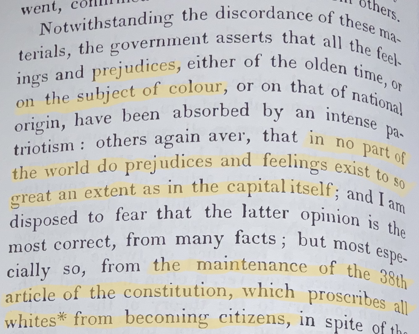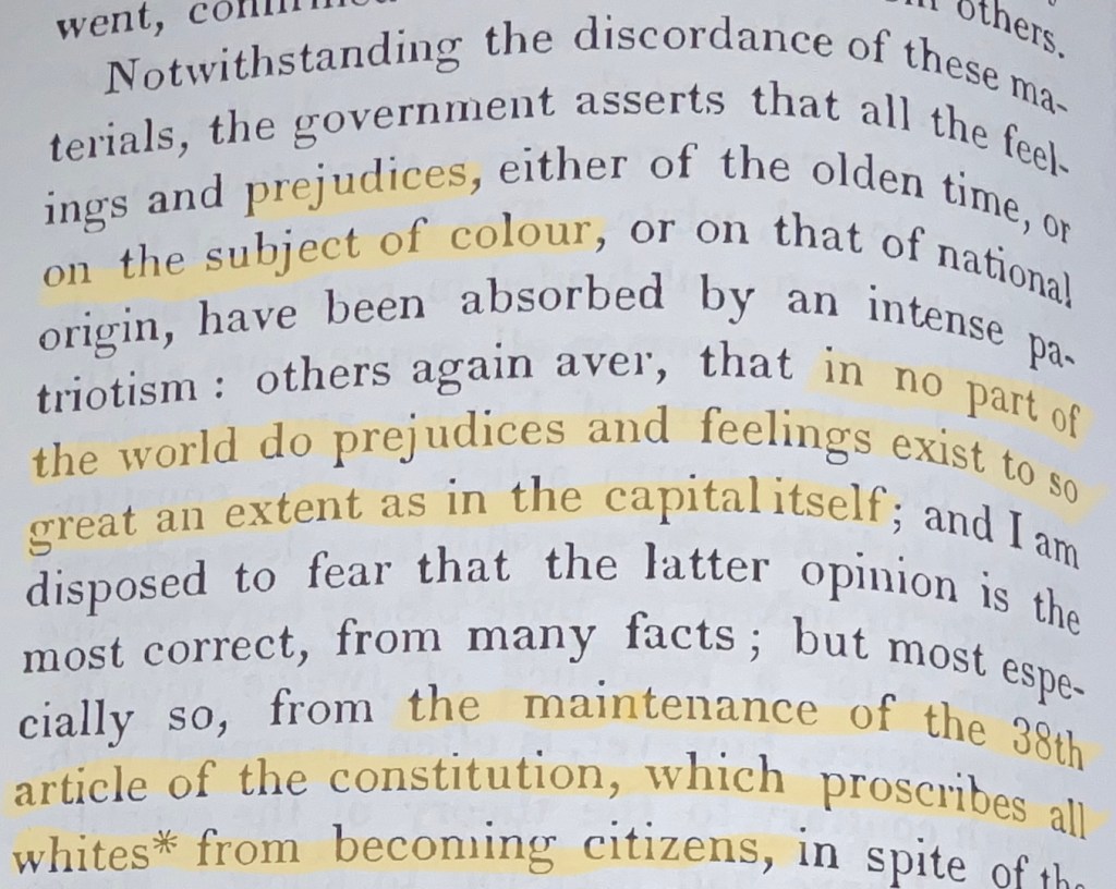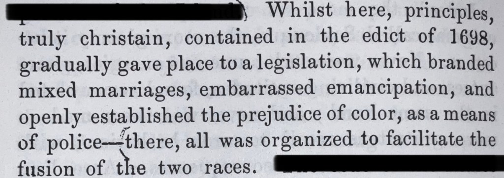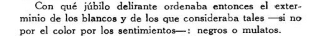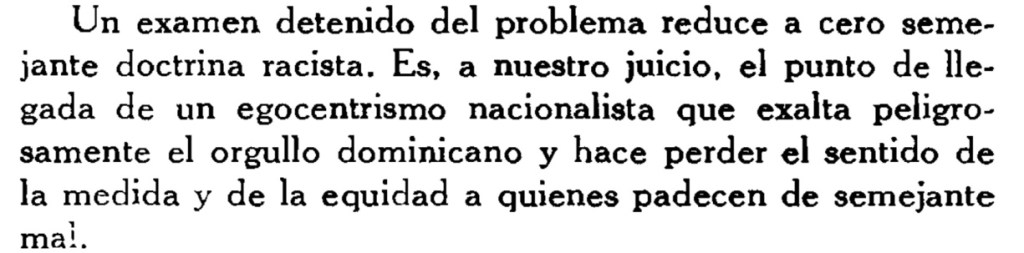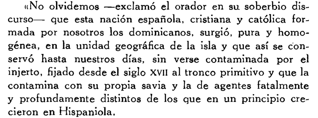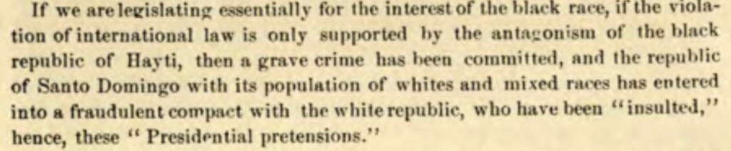 Si nosotros hemos legislado por el interés de la raza negra, si la violación de las leyes internacionales se sostiene sólo del antagonismo de la Repúblic negra de Haití, entonces se ha cometido un crimen grave y la República de Santo Domingo (República Dominicana) con su población de blancos y mixtos se ha involucrado en un acuerdo fradulento con una república de blancos (Estados Unidos), la que ha sido «ofendida», de ahí las «pretensiones presidenciales».