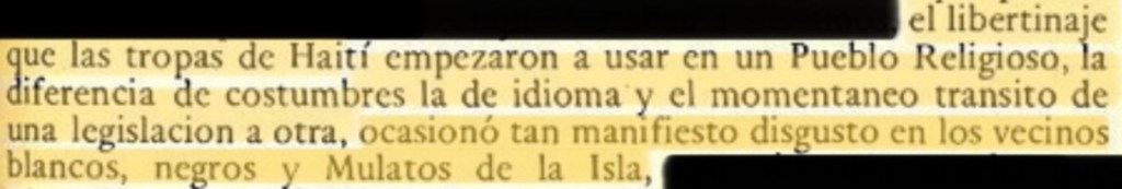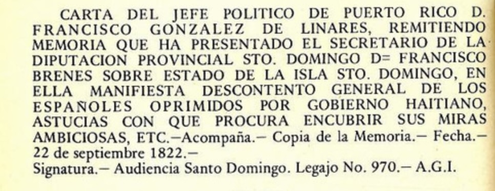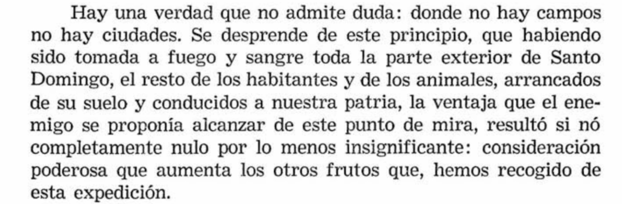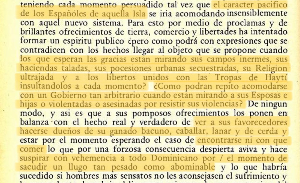 «Me informó que los proyectos de ellos (haitianos) después que tuvieran el control de Santo Domingo era de ofrecer todos los artículos demandados. Ya penetrados (los haitianos) adentro de las murallas debían masacrar a toda la población sin ninguna distinción. Luego debían abandonar el lugar excepto los hombres (haitianos) necesario para demoler el pueblo (Santo Domingo). Masacrar a todos los españoles blancos y libres del país (los antepasados de los dominicanos) y secuestrar a la parte francesa (Haití) al resto de los esclavos y los animales.