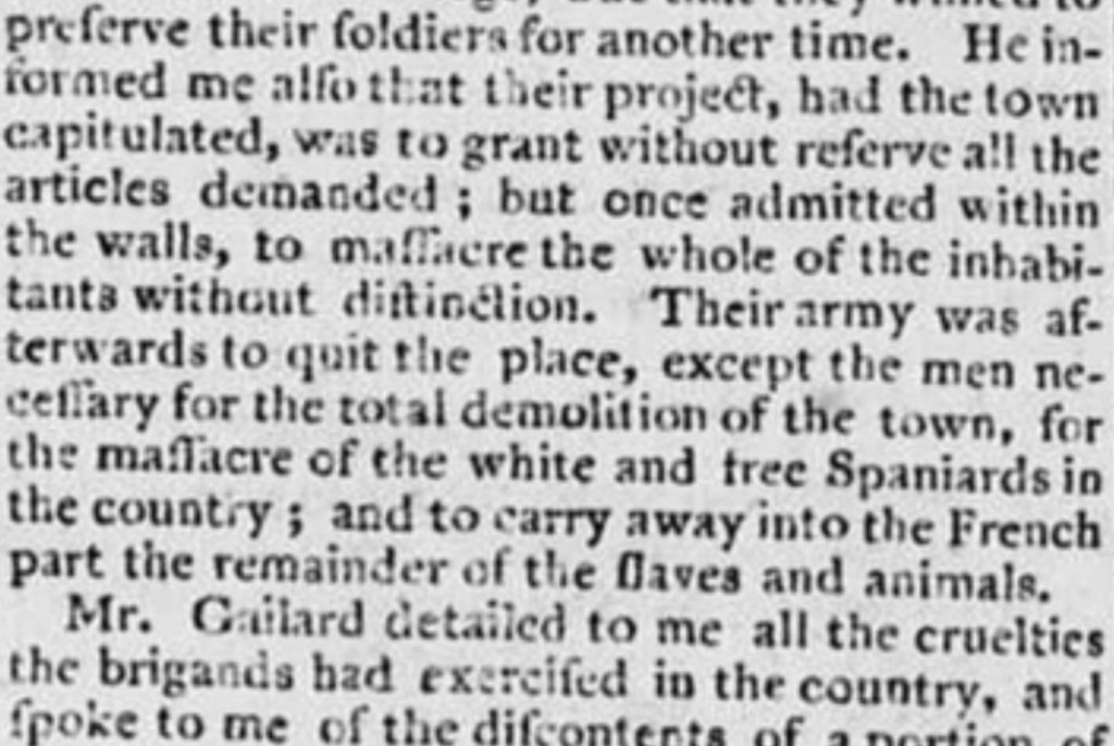 «El lunes del 7 de julio a las 11am llegó desde Dajabón (un pueblo pequeño a una distancia de cuatro leguas de Fort Dauphin) un fraile español, escoltado por seis guardias. Varias personas le preguntaron qué noticias traía. Su respuesta fue «ninguna» y luego dijo que todo estaba seguro. Como una hora después llegaron Jean François (general de los bandidos -haitianos- quien siempre ha estado en buenas con los españoles -dominicanos-) y Benjamín, su primer capitán, con 500…»
