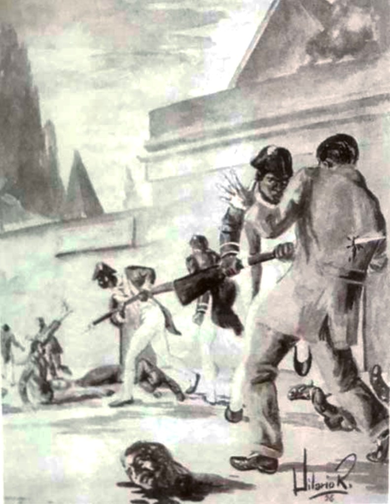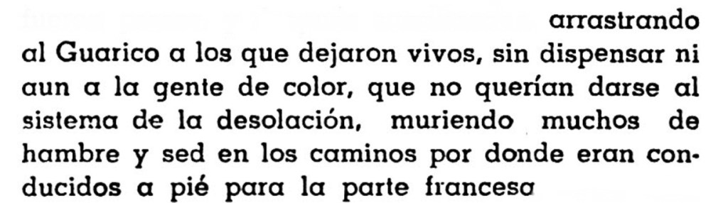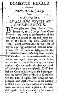 «…ó 600 negros (haitianos) y 58 caballeros. De esa cantidad habían alrededor de 400 con armas de fuego mientras los demás tenían espadas y garrotes. Cuando todos ellos llegaron al mercado, Jean François dio la orden para que mataran a todos los franceses blancos sin distinción de edad, sexo, rango social o profesión.