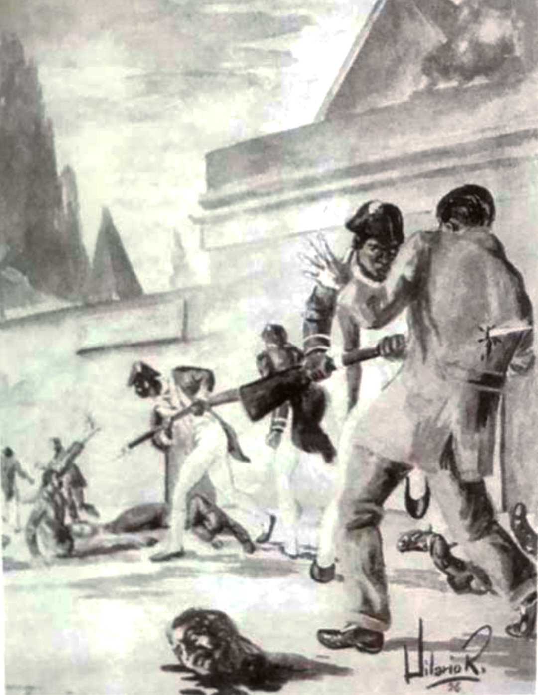 Las masacres no son nuevas en Haití. Un dibujo de la masacre de 1804, la primera efectuada en Haití a nivel nacional y por haitianos. Tan sólo en Cabo Haitiano las víctimas eran alrededor de 6,000 no obstante que se efectuó en todo el territorio haitiano.