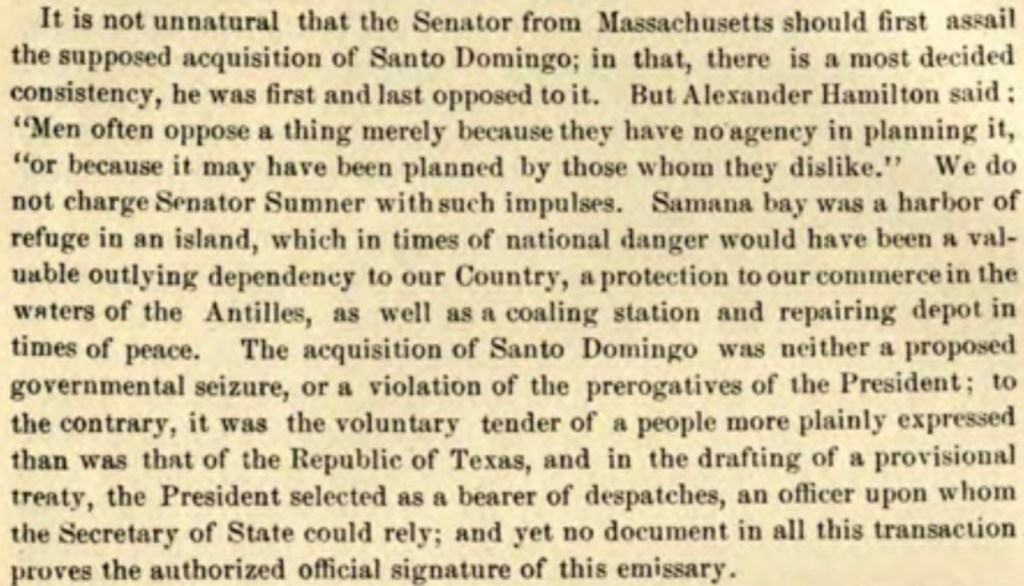 No es inusual que el senador de Massachessetts (Charles Sumner) atacó violentamemte la adquisición de Santo Domingo (República Dominicana). Hay una consistencia y es que desde el principio hasta el final estuvo opuesto. Alexander Hamilton decía que «el hombre se opone a algo por el simple hecho que no tienen una forma legítima para oponerse o porque pudo ser hecho por aquellos a los que no les agrada». Nosotros no decimos que el senador Sumner tenía estos impulsos. La bahía de Samaná ha sido un refugio en la isla, la cual sería muy ventagosa para nuestro país (Estados Unidos) en tirmpo de peligro nacional, una protección a nuestro comercio en el mar de las Antillas, además de una recepción de carbón y un deposito para reparar embarcaciones en tiempo de paz.