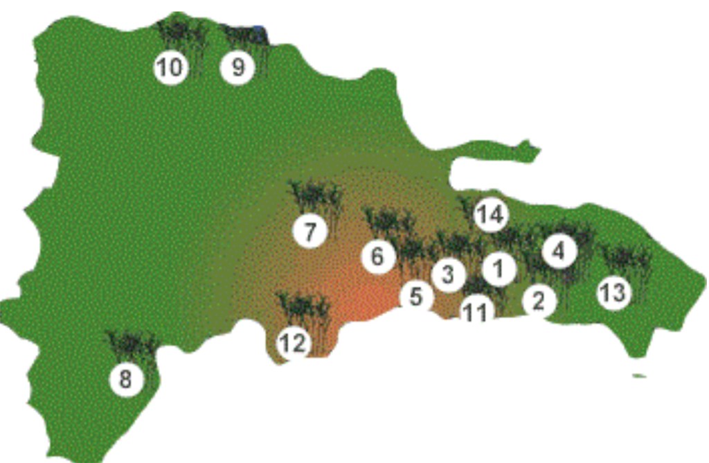 Lugar donde están los ingenios en la República Dominicana. El año de fundación está en paréntesis. Muchos han dejado de operar y/o dejaron de existir. 1. Consuelo (1881), 11. Cristóbal Colón (1883), 4. Porvenir (1884), 2. Santa Fé (1885), 12. CAEI (1893), 6. Ozama (1895), 10. Amistad (1899), 5. Boca Chica (1916), 9. Montellano (1918), 13. Central Romana (1918), 8. Barahona (1920), 7. Río Haina (1950) and 14. Pringamosa.