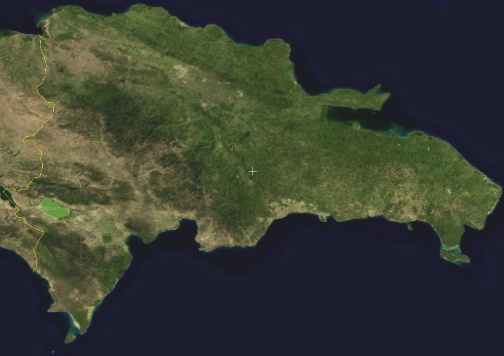 La República Dominicana vista desde el espacio. Las sonas marrones son semiáridas, en las verdes llueve mas y en las grises están urbanizadas.