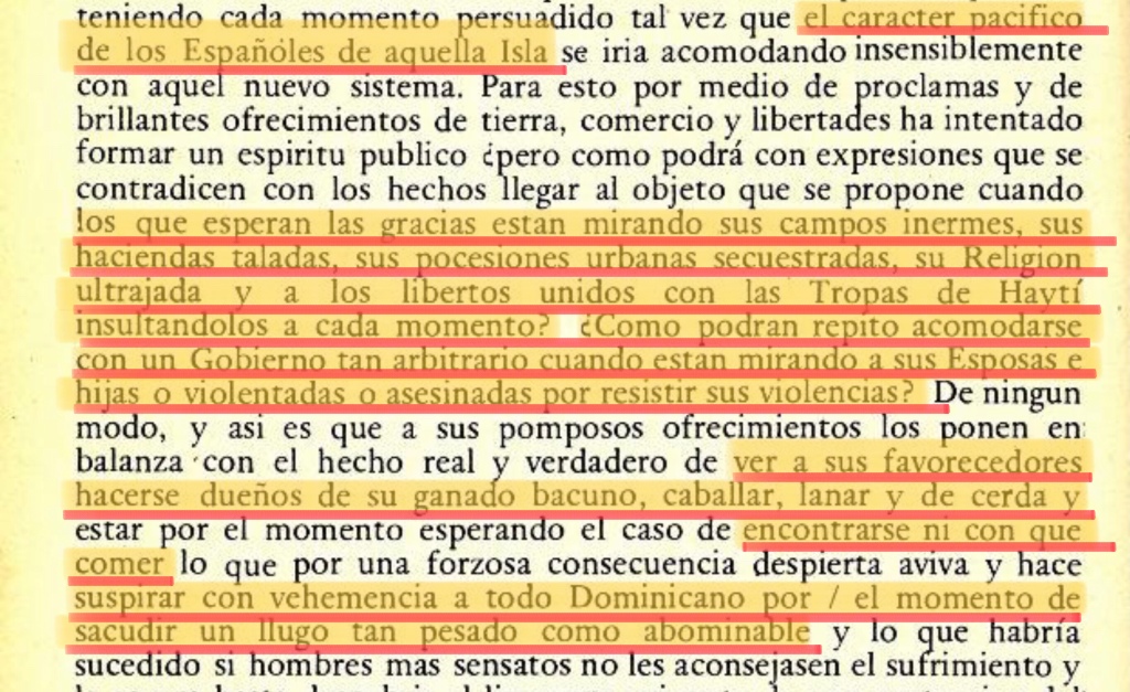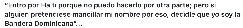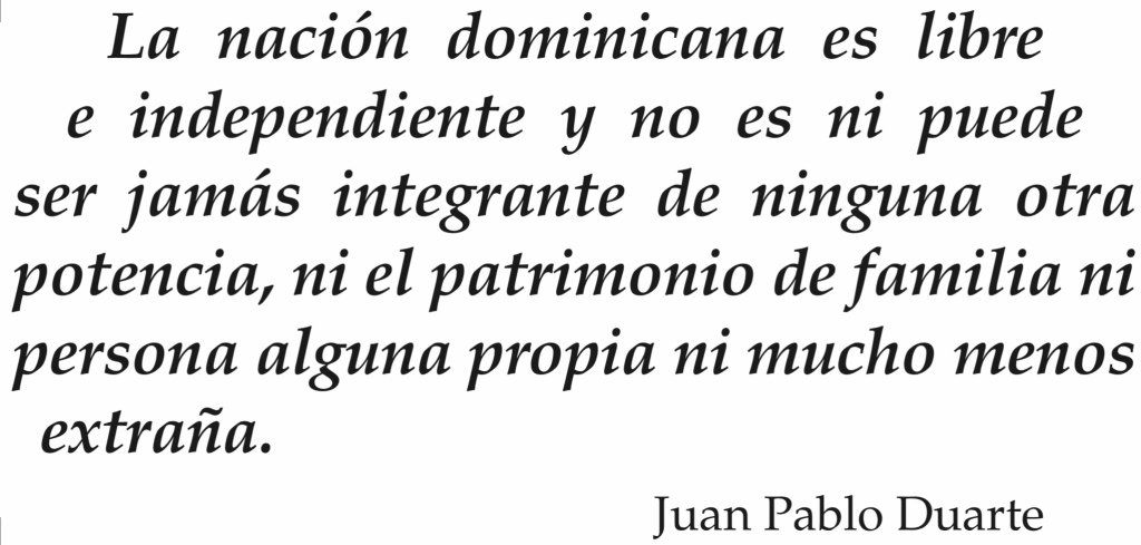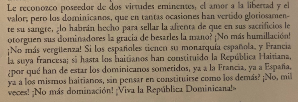 Yo admiro al pueblo haitiano, veo cómo vence y sale de la triste condición de esclavo para constituirse en nación libre e independiente. Le reconozco poseedor de dos virtudes eminentes: el amor a la libertad y el valor, pero los dominicanos que en tantas ocasiones han vertido su sangre, ¿lo habrán hecho solo para sellar la afrenta de que en premio de sus sacrificios le otorguen sus dominadores la gracia de besarles la mano? ¡No más humillación! ¡No más vergüenza! Si los españoles tienen su monarquía española y Francia la suya francesa; si hasta los haitianos han constituido la República Haitiana, ¿por qué han de estar los dominicanos sometidos ya a la Francia, ya a España, ya a los haitianos, sin pensar en constituirse como los demás? ¡No, mil veces no! ¡No más dominación! ¡Viva la República Dominicana!