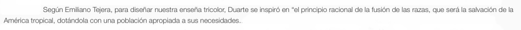 «Según Emiliano Tejera, para diseñar nuestra enseña tricolor, Duarte se inspiró en el principio natural de la fusión de las razas, que será la salvación de la América tropical, dotándola con una población apropiada a sus necesidades».