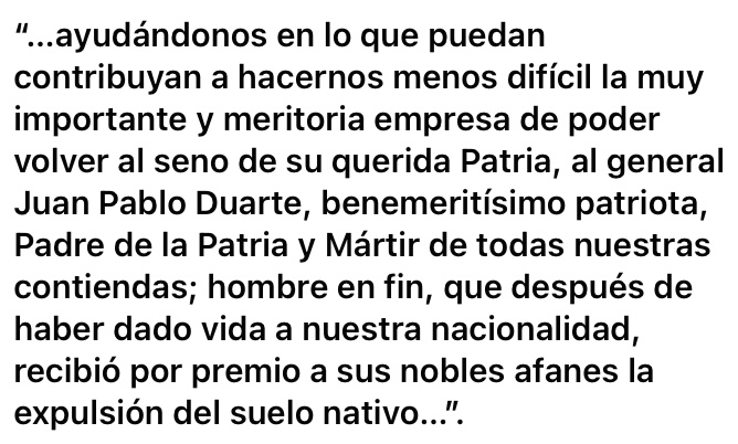 Las palabras que siguen evidencian una preocupación con el porvenir de Juan Pablo Duarte, a pesar que estaba exiliado en Venezuela y era un hombre blanco.